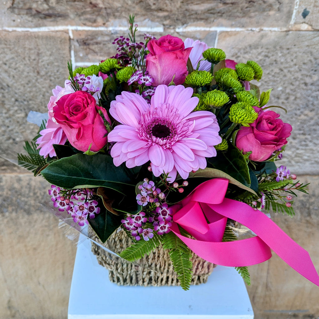 This vibrant arrangement comes in a reusable basket using seasonal blooms of gerberas, roses, green buttons and Geraldton wax. Very much a fan favourite!