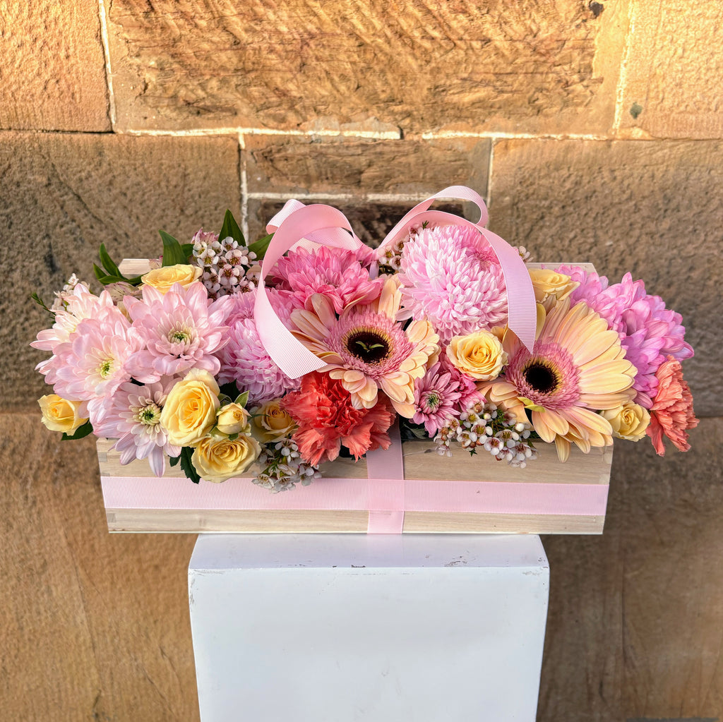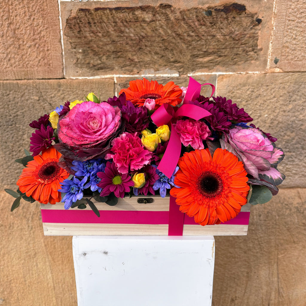 Betty - In honour of our beautiful friend/customer and someone we called family. This beautiful arrangement of seasonal blooms set in a wooden wine box is the perfect gift for someone you love. Just like Betty, it's a little different, but absolutely unforgettable.