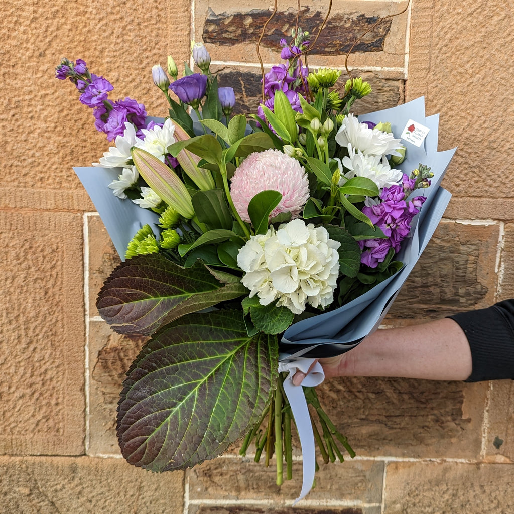 A beautiful bouquet of stock, Asiatic lilies, disbuds. chrysanthemums, green buttons, lisianthus and alstroemeria and wrapped in complimenting paper.