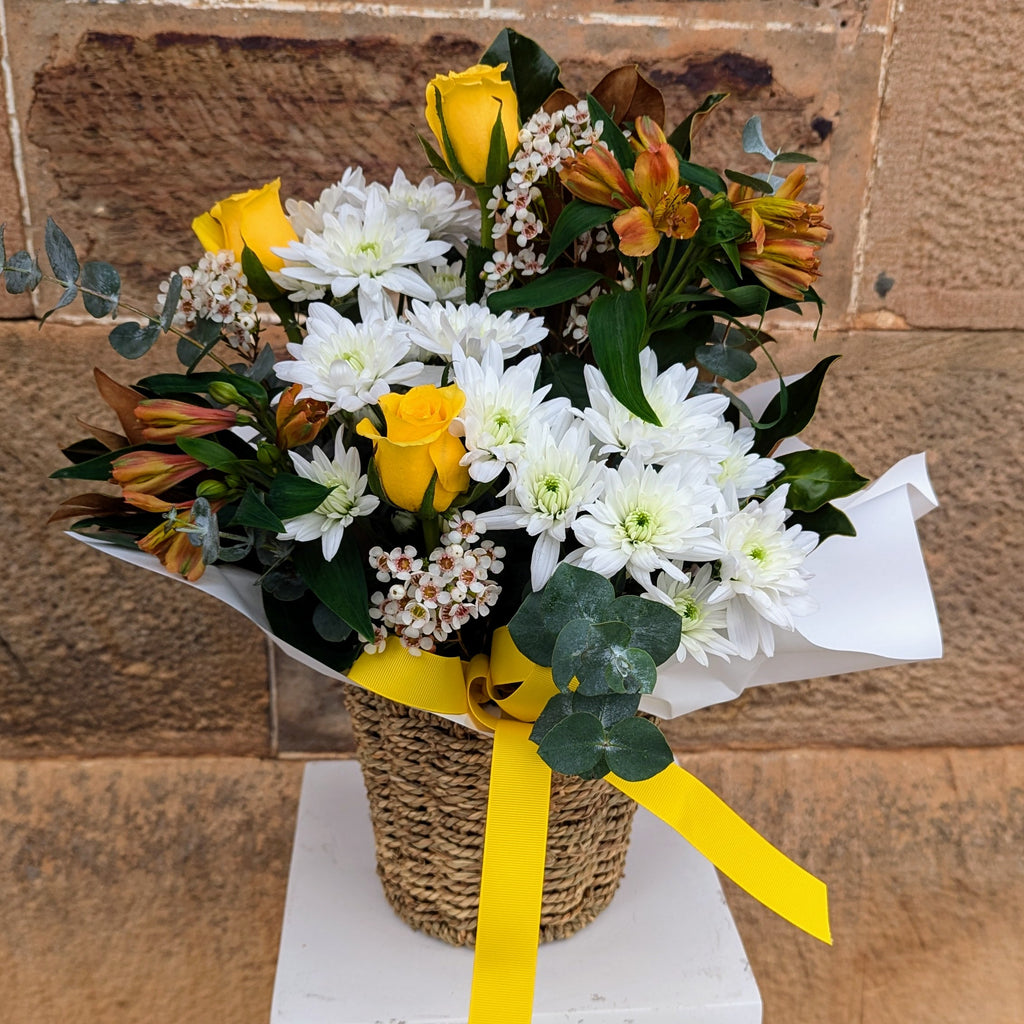 This pretty cottage themed arrangement is a traditional favourite. It has a soft colour palette of yellow and white using beautiful seasonal blooms including roses, alstroemeria, chrysanthemums and gypsophila, presented in a reusable basket.