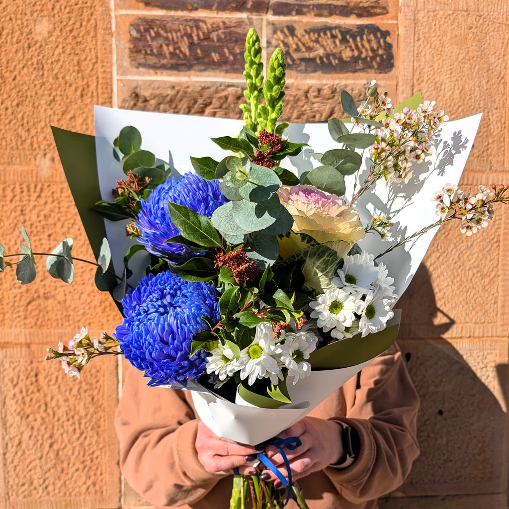 Like a daydream caught in bloom, this whimsical bouquet of blues and whites captures the essence of lighthearted beauty and quiet elegance.