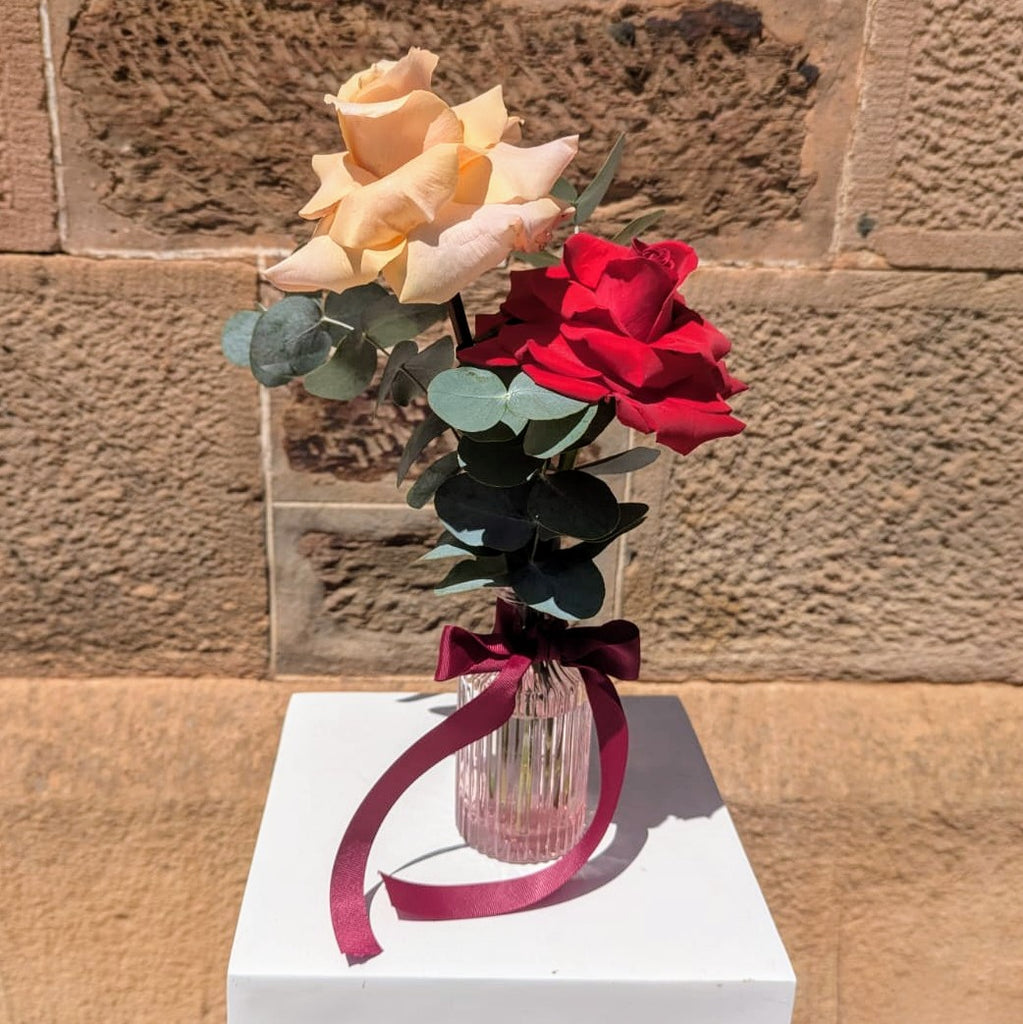 This charming Valentine’s Day flower arrangement captures the essence of romance and fun, beautifully displayed in a petite vintage bottle with two stunning reflexed roses, each one symbolizing love and devotion.